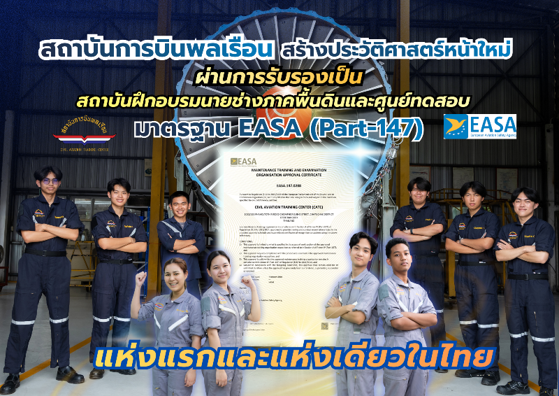 สถาบันการบินพลเรือน (สบพ.) สร้างความก้าวหน้าครั้งสำคัญให้กับอุตสาหกรรมการบินของประเทศไทย ได้รับการรับรองให้เป็น สถาบันฝึกอบรมนายช่างภาคพื้นดิน Part-147 Maintenance Training and Examination Organisation ภายใต้มาตรฐานสำนักงานความปลอดภัยด้านการบินแห่งสหภาพยุโรป หรือ European Union Aviation Safety Agency (EASA) ซึ่งถือเป็นสถาบันแห่งแรกและแห่งเดียวของประเทศไทย ที่ได้รับการรับรองตามมาตรฐานการบินของสหภาพยุโรป ในสถานะ Maintenance Training Organisation Approval (MTOA) ที่ออกโดย EASA โดยตรง ไม่ผ่านเครือข่ายพันธมิตร สะท้อนถึงศักยภาพและความพร้อมการพัฒนาช่างอากาศยานในระดับสากลอย่างแท้จริงของ สบพ. โดยได้รับการรับรองในหลักสูตรระดับ Basic Training ในประเภทใบอนุญาต B1.1 (Aeroplanes Turbine) และ B1.2 (Aeroplanes Piston)