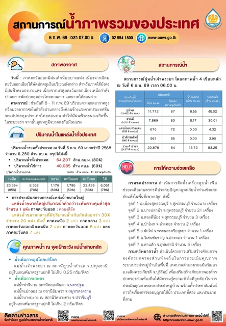 2. สถานการณ์น้ำอ่างเก็บน้ำในภาพรวม : ปริมาณน้ำรวม 80% ของความจุเก็บกัก (64,207 ล้าน ลบ.ม.) ปริมาณน้ำใช้การ 70% (40,085 ล้าน ลบ.ม.)