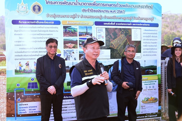 4. โครงการพัฒนาน้ำบาดาลเพื่อการเกษตรพลังงานแสงอาทิตย์ ประจำปีงบประมาณ พ.ศ. 2567 ณ บ้านทุ่งนาคราช หมู่ที่ 7 ตำบลหนองหญ้า อำเภอเมืองกาญจนบุรี จังหวัดกาญจนบุรี มีสมาชิกกลุ่มเกษตรกรเข้าร่วม จำนวน 9 ราย พื้นที่ได้รับประโยชน์รวม 76 ไร่ โดยเกษตรกรปลูก ข้าวโพดอ่อน มันสำปะหลัง ผักสวนครัว และอ้อย เป็นหลัก มีปริมาณน้ำบาดาลเพื่อการเกษตรประมาณ 38,000 ลูกบาศก์เมตรต่อปี ส่งผลให้เกษตรกรสามารถมีแหล่งน้ำต้นทุนสำหรับการเพาะปลูกได้อย่างเพียงพอตลอดทั้งปี และช่วยส่งเสริมให้เกษตรกรมีรายได้เพิ่มขึ้นอย่างต่อเนื่อง