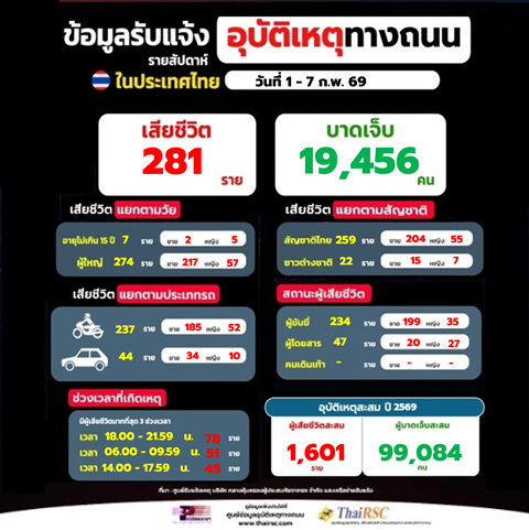 สถานการณ์อุบัติเหตุทางถนนในประเทศไทย รายสัปดาห์ 1-7 ก.พ. 69 8 กุมภาพันธ์ 2026Thailandplusประชาสัมพันธ์ Facebook iconFacebookTwitter iconTwitterLINE iconLineสถานการณ์อุบัติเหตุทางถนนในประเทศไทย วันที่ 7 ก.พ. 69