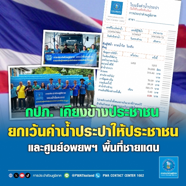 การประปาส่วนภูมิภาค (กปภ.) เผยมาตรการยกเว้นค่าน้ำประปาและค่าบริการทั่วไปให้ประชาชนและศูนย์อพยพหรือศูนย์พักพิงพื้นที่ชายแดนไทย-กัมพูชา ตลอดรอบบิลเดือนมกราคม 2569 และย้อนหลังสูงสุด 4 เดือนในจุดอพยพหลัก เพื่อบรรเทาความเดือดร้อนและลดภาระค่าใช้จ่ายให้แก่ผู้ประสบภัยในพื้นที่เสี่ยงภัยพิบัติกรณีฉุกเฉินอย่างทั่วถึง