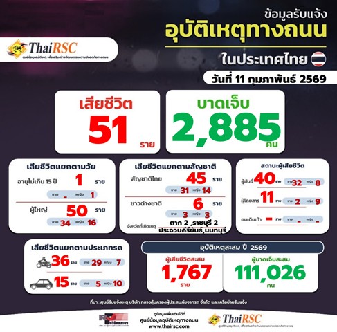 สถานการณ์อุบัติเหตุทางถนนในประเทศไทย วันที่ 11 ก.พ. 69 12 กุมภาพันธ์ 202612 กุมภาพันธ์ 2026Thailandplusประชาสัมพันธ์ Facebook iconFacebookTwitter iconTwitterLINE iconLineสถานการณ์อุบัติเหตุทางถนนในประเทศไทย วันที่ 11 ก.พ. 69