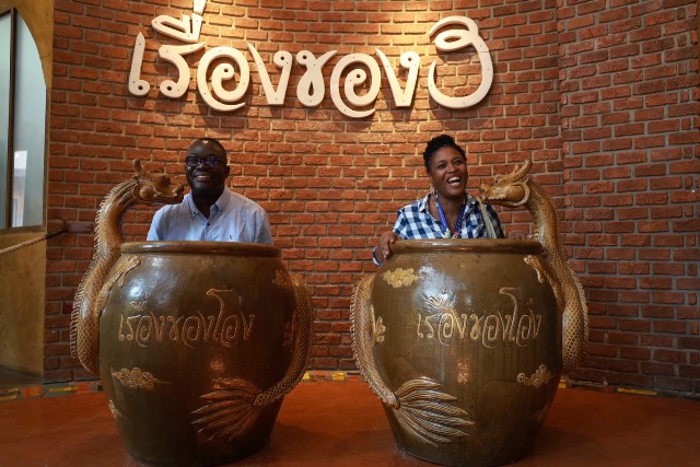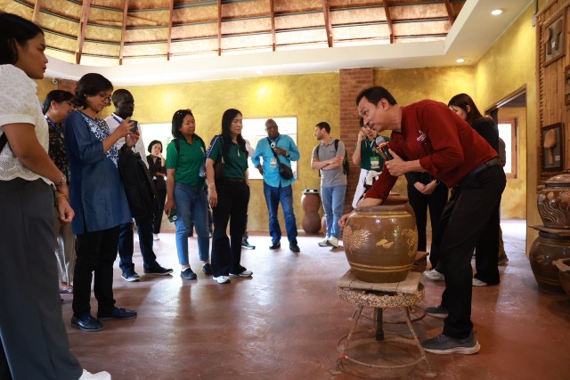 จากนั้น เดินทางไปยังร้านโอ่งข้าวโอ่งน้ำ จังหวัดราชบุรี หรือโครงการเรื่องของโอ่ง – Pottery Legend) ที่ประกอบธุรกิจร้านอาหาร คาเฟ่ และศูนย์การเรียนรู้เรื่องโอ่งมังกรที่มีชื่อเสียง โดดเด่นด้วยอาหารไทยฟิวชั่น เมนูเด็ดเช่น ไก่อบโอ่ง ข้าวเหนียวมะม่วง เสิร์ฟในภาชนะโอ่งจิ๋ว โดยใช้ภูมิปัญญาท้องถิ่นควบคู่กับการพัฒนารูปแบบผลิตภัณฑ์และบรรจุภัณฑ์ให้ตอบโจทย์ตลาดยุคใหม่ สร้างอัตลักษณ์สินค้าเกษตรชุมชน และช่วยยกระดับรายได้ให้กับเกษตรกรในพื้นที่อย่างเป็นรูปธรรม นอกจากนี้ ยังได้เข้าเยี่ยมชมอุทยาน ณ สัทธา จังหวัดราชบุรี แหล่งเรียนรู้ด้านศิลปวัฒนธรรมและภูมิปัญญาไทย ซึ่งสะท้อนการบูรณาการทรัพยากรทางวัฒนธรรม วิถีชีวิต และการท่องเที่ยวเชิงสร้างสรรค์เพื่อส่งเสริมเศรษฐกิจชุมชนและการพัฒนาท้องถิ่นอย่างยั่งยืน