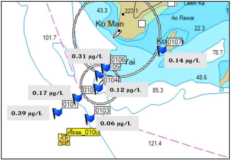 จากนั้นได้ตรวจพบตำแหน่งเรือใต้น้ำอย่างชัดเจนที่ความลึกประมาณ 61 เมตร ห่างจากจุดแจ้งเหตุเดิมไปทางเหนือประมาณ 2 กิโลเมตร และยังพบคราบน้ำมันบางส่วนบริเวณผิวน้ำเหนือจุดซากเรือ โดยศูนย์วิจัยทรัพยากรทางทะเลและชายฝั่งทะเลอันดามันตอนบน (ศวอบ.) ได้ดำเนินการเก็บตัวอย่างน้ำทะเลในพื้นที่เฝ้าระวัง โดยเฉพาะบริเวณแนวปะการังเกาะแก้วน้อย เกาะแก้วใหญ่ และพื้นที่ใกล้เคียง ผลการตรวจพบค่าปิโตรเลียมไฮโดรคาร์บอนรวม (TPH) อยู่ในช่วง 0.06–0.39 ไมโครกรัมต่อลิตร ซึ่งไม่เกินค่ามาตรฐานคุณภาพน้ำทะเลประเภทที่ 2 เพื่อการอนุรักษ์แหล่งปะการัง (<0.5 ไมโครกรัมต่อลิตร) และไม่พบคราบน้ำมันบริเวณพื้นที่คุ้มครองเกาะราชาใหญ่