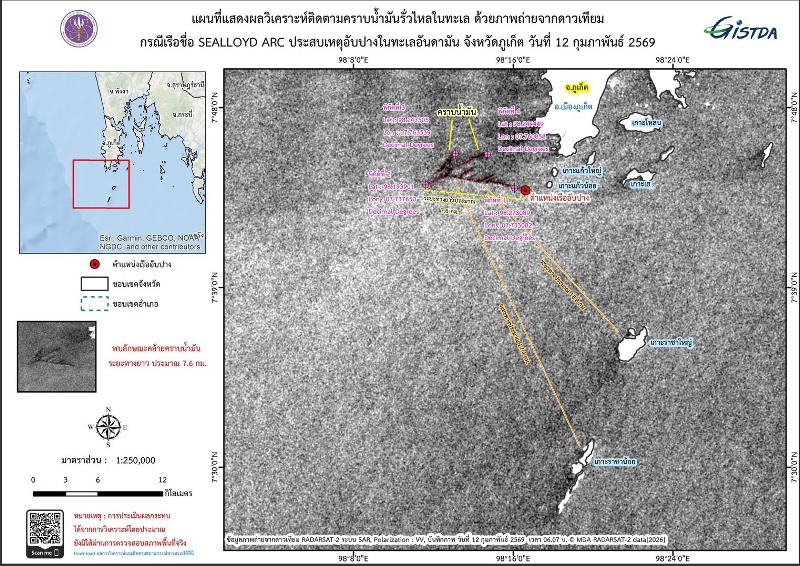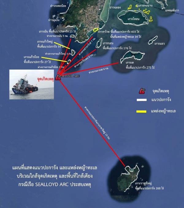 วันที่ 12 กุมภาพันธ์ 2569 กรมทรัพยากรทางทะเลและชายฝั่ง รายงานความคืบหน้ากรณีเรือบรรทุกสินค้า SEALLOYD ARC PANAMA สัญชาติปานามา ประสบเหตุอัปปางเมื่อวันที่ 7 กุมภาพันธ์ 2569 เวลาประมาณ 15.30 น. บริเวณทิศตะวันตกเฉียงใต้ของเกาะแก้วน้อย จังหวัดภูเก็ต ระยะห่างจากฝั่งประมาณ 1.82 ไมล์ทะเล ในระดับความลึกประมาณ 55 เมตร โดยเรือลำดังกล่าวบรรทุกน้ำมันความหนัก (Heavy Oil) ประมาณ 98 ตัน น้ำมันเบา (Marine Diesel Oil) ประมาณ 32 ตัน และสารเคมีบางประเภท ซึ่งทำให้มีน้ำมันรั่วลงสู่ทะเลจากรอยรั่วใต้ท้องเรือ ดร.ปิ่นสักก์ สุรัสวดี อธิบดีกรมทรัพยากรทางทะเลและชายฝั่ง จึงได้สั่งการให้หน่วยงานที่เกี่ยวข้องเข้าร่วมตรวจสอบผลกระทบต่อทรัพยากรทางทะเลอย่างเร่งด่วน