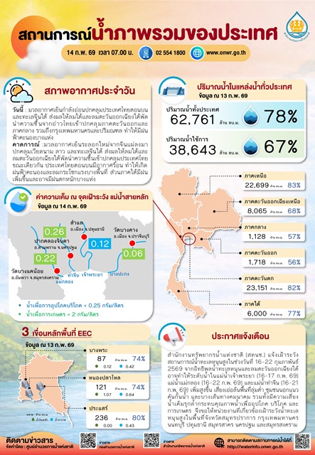 2. สถานการณ์น้ำอ่างเก็บน้ำในภาพรวม : ปริมาณน้ำรวม 78% ของความจุเก็บกัก (62,761 ล้าน ลบ.ม.) ปริมาณน้ำใช้การ 67% (38,643 ล้าน ลบ.ม.)