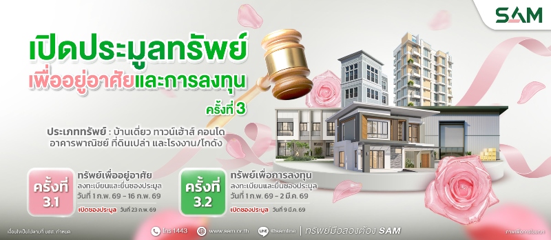 ทั้งนี้ ใน 2569 นี้ SAM ยังคงมุ่งเน้นการเป็นกลไกสำคัญในการบริหารจัดการสินทรัพย์เพื่อขับเคลื่อนเศรษฐกิจของประเทศ โดยการเปิดประมูลในครั้งนี้ได้คัดเลือกทรัพย์มือสองที่มีศักยภาพสูง ตั้งอยู่บนทำเลเด่นทั่วประเทศ มานำเสนอให้กับผู้ที่กำลังมองหาที่อยู่อาศัยและนักลงทุนที่ต้องการขยายธุรกิจ