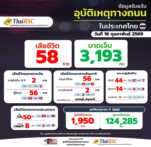 สถานการณ์อุบัติเหตุทางถนนในประเทศไทย วันที่ 16 ก.พ. 69