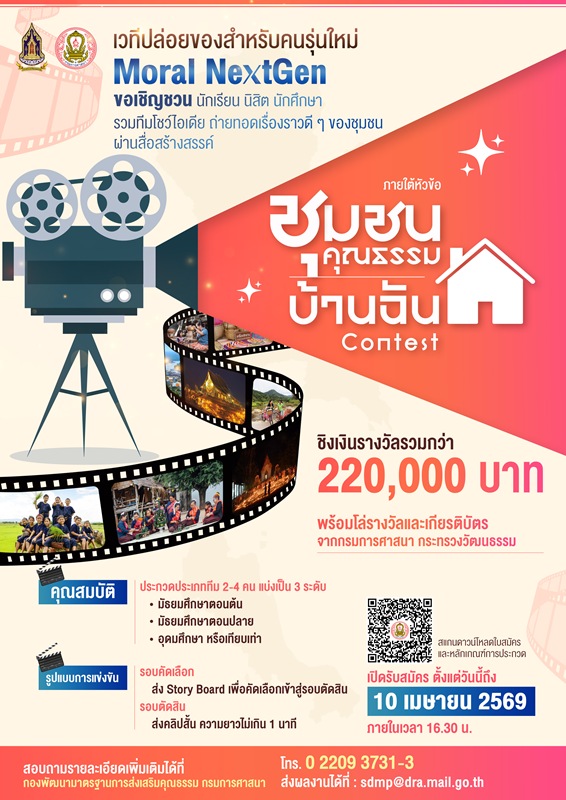 นายชัยพล สุขเอี่ยม อธิบดีกรมการศาสนา เปิดเผยว่า กรมการศาสนา กระทรวงวัฒนธรรม เดินหน้าขับเคลื่อนแผนปฏิบัติการด้านการส่งเสริมคุณธรรมแห่งชาติ ระยะที่ 2 (พ.ศ. 2566 – 2570) โดยดำเนินการจัดประกวดการผลิตสื่อคุณธรรมสำหรับเด็กและเยาวชน ภายใต้หัวข้อ “ชุมชนคุณธรรมบ้านฉัน” ประจำปีงบประมาณ พ.ศ. 2569 ภายใต้โครงการ “คุณธรรม เราจะทำ (Moral NextGen Model)” เปิดพื้นที่ให้คนรุ่นใหม่ใช้ความคิดสร้างสรรค์ถ่ายทอดเรื่องราวคุณธรรมและความดีงามของชุมชนผ่านคลิปสั้น ความยาวไม่เกิน 60 วินาที ชิงเงินรางวัลรวมกว่า 220,000 บาท พร้อมโล่รางวัลและเกียรติบัตรจากกรมการศาสนา กระทรวงวัฒนธรรม ซึ่งการจัดกิจกรรมนี้มีเป้าหมายเพื่อส่งเสริมให้เด็กและเยาวชนตระหนักถึงความสำคัญของชุมชนตามหลักคุณธรรม 5 ประการ ได้แก่ พอเพียง วินัย สุจริต จิตอาสา และกตัญญู ควบคู่กับหลัก 3 มิติ คือ หลักธรรมทางศาสนา หลักปรัชญาของเศรษฐกิจพอเพียง และวิถีวัฒนธรรมไทยที่ดีงาม อันจะนำไปสู่การสร้างความรัก ความสามัคคี และการอยู่ร่วมกันอย่างสมานฉันท์ในสังคม ส่งเสริมให้เกิดอินฟลูเอนเซอร์เพื่อเป็นกระบอกเสียงด้านคุณธรรม และสร้างกลไกการติดตามและประเมินผลการทำและขยายผลความดี ให้เด็กและเยาวชนได้มีบทบาทเป็น “ผู้ผลิตสื่อ” อย่างแท้จริง ตั้งแต่การคิดวิเคราะห์ประเด็นในชุมชน การออกแบบบทภาพ (Storyboard) การวางโครงเรื่อง การถ่ายทำ ตลอดจนการเผยแพร่ผ่านแพลตฟอร์มออนไลน์ ซึ่งเป็นการส่งเสริมทักษะการสื่อสารยุคดิจิทัลควบคู่กับการปลูกฝังคุณธรรม จริยธรรม และความรับผิดชอบต่อสังคม โดยมีวิทยากรและผู้ผลิตสื่อมืออาชีพที่มีความรู้ความสามารถและประสบการณ์เป็นผู้ถ่ายทอดเพื่อให้คลิปสั้นมีคุณภาพน่าสนใจและได้รับการยอมรับจากผู้ชมทุกเพศทุกวัย