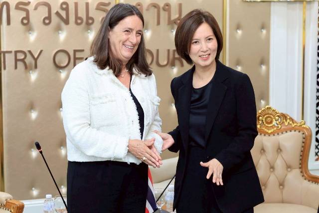 นางสาวตรีนุช กล่าวภายหลังการเข้าพบหารือของเอกอัครราชทูตวิสามัญผู้มีอำนาจเต็มแห่งสหภาพยุโรปประจำประเทศไทย ว่า แม้ว่าในขณะนี้อยู่ในช่วงของรัฐบาลรักษาการ แต่กระทรวงแรงงานยังคงเดินหน้าปฏิบัติหน้าที่อย่างต่อเนื่องและเต็มที่ โดยให้ความสำคัญในการขับเคลื่อนนโยบายหลักและประเด็นเร่งด่วนด้านแรงงาน 5 ด้าน ได้แก่ 1. การแก้ปัญหาการขาดแคลนแรงงานโดยเร่งทำ MOU กับต่างชาติเพื่อทดแทน แรงงานที่ขาดแคลน ตลอดจนขึ้นทะเบียนแรงงานต่างด้าวให้ถูกต้องตามมติ ครม. 2. การยกระดับและเพิ่มทักษะ (Up Skill / Re Skill) ให้แรงงานไทยก้าวทัน เทคโนโลยี การส่งเสริมการเพิ่มทักษะเพื่อเพิ่มโอกาสการจ้างงาน มุ่งเน้นการ พัฒนาทักษะดิจิทัลและ AI (Demand Driven) ผ่านการขับเคลื่อนภารกิจ “คนไทยต้องมีงานทำ” โดยดำเนินการผ่านศูนย์บริการจัดหางานทั่วประเทศและแอพพลิเคชั่นไทยมีงานทำ ซึ่งได้ดำเนินนโยบายเชิงรุก ผ่านแคมเปญ“คนไทยต้องมีงานทำ” มีการเปิดศูนย์บริการจัดหางานเพื่อคนไทย 87 แห่งทั่วประเทศ เพื่อให้เข้าถึงงานได้ง่ายขึ้น เน้นจับคู่ทักษะและฝึกอบรม 3. การส่งเสริมสวัสดิการแรงงานและความมั่นคงในชีวิต อาทิ เรื่อง ความปลอดภัย ในสถานที่ทำงาน การเพิ่มเงินทดแทนและสวัสดิการประกันสังคมมาตรา 40 และการเพิ่มวันลาคลอดบุตรจากเดิม 98 วัน เป็น 120 วัน 4. สร้างโอกาสให้แรงงานไทยมีงานทำ และ 5. การใช้ประโยชน์จากเทคโนโลยี