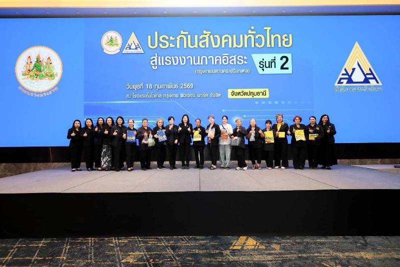 เมื่อวันที่ 18 กุมภาพันธ์ 2569 นางสาวกาญจนา พูลแก้ว เลขาธิการสำนักงานประกันสังคม มอบหมายให้นางสาวนันทินี ทรัพย์ศิริ ที่ปรึกษาด้านประสิทธิภาพสำนักงานประกันสังคม เป็นประธานเปิดโครงการ “ประกันสังคม ทั่วไทยสู่แรงงานภาคอิสระ รุ่นที่ 2 (กรุงเทพมหานคร/ปริมณฑล)” ณ โรงแรมโนโวเทล กรุงเทพฯ ฟิวเจอร์ พาร์ค รังสิต จังหวัดปทุมธานี โดยมีนางสาวนฤมล บุญมี ผู้อำนวยการสำนักเสริมสร้างความมั่นคงแรงงานนอกระบบ คณะผู้บริหารสำนักงานประกันสังคม ประกันสังคมจังหวัดปทุมธานี สมุทรปราการ สมุทรสาคร นครปฐม นนทบุรี ผู้อำนวยการกรุงเทพมหานครพื้นที่ 1 – 12 ผู้ประกันตน และเครือข่ายประกันสังคมในพื้นที่กรุงเทพมหานครและจังหวัดปริมณฑล