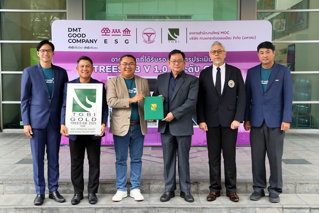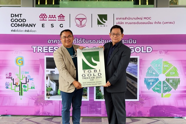 ดร.ศักดิ์ดา พรรณไวย (ซ้าย) กรรมการผู้จัดการ บมจ.ทางยกระดับดอนเมือง (DMT) ได้รับป้ายสัญลักษณ์ TGBI และประกาศนียบัตรรับรองอาคารสำนักงานใหญ่ DMT ผ่านมาตรฐาน เกณฑ์การประเมินความยั่งยืนทางพลังงานและสิ่งแวดล้อมไทย สำหรับอาคารระหว่างใช้งาน TREES – EB ในระดับ Gold