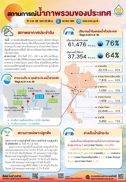 สรุปสถานการณ์น้ำภาพรวมของประเทศ วันที่ 21 ก.พ. 69 เวลา 7.00 น.