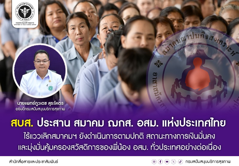 เมื่อวันที่ 18 กุมภาพันธ์ 2569 นายแพทย์ภูวเดช สุระโคตร อธิบดีกรม สบส. ให้สัมภาษณ์ว่า ตามที่กระทรวงสาธารณสุขมีนโยบายพัฒนาศักยภาพ และสวัสดิการเพื่อเสริมสร้างขวัญกำลังใจให้กับ อสม. ควบคู่กันมาอย่างต่อเนื่อง จึงมีการจัดตั้ง “สมาคมฌาปนกิจสงเคราะห์อาสาสมัครสาธารณสุขประจำหมู่บ้านแห่งประเทศไทย” ขึ้น เมื่อเดือนพฤศจิกายน พ.ศ. 2562 เพื่อเป็นสวัสดิการ ตอบแทนความเป็นจิตอาสาแก่ อสม. และเป็นหลักประกันความมั่นคง ในการช่วยเหลือเงินสงเคราะห์ให้แก่ครอบครัวเมื่อ อสม.ที่เป็นสมาชิกเสียชีวิตลง แต่ด้วยมีการเผยแพร่ข้อมูลผ่านสื่อว่ามีการเลิกสมาคมฌาปนกิจสงเคราะห์พร้อมกันในหลายจังหวัด โดยเฉพาะในภาคอีสาน ทั้งจังหวัดศรีสะเกษ และจังหวัดนครราชสีมา ซึ่งหนึ่งในสมาคมที่มีการเลิกนั้น คือ “สมาคมฌาปนกิจสงเคราะห์ชมรมสาธารณสุขแห่งประเทศไทย” จึงสร้างความตื่นตระหนก ให้สมาชิก ฌกส. อสม. บางส่วนเกิดความกังวลและความเข้าใจคลาดเคลื่อนว่าจะกระทบต่อสิทธิประโยชน์และการดำเนินงานของสมาคม ฌกส. อสม. แห่งประเทศไทย ด้วยนั้น ในการนี้ กรม สบส. ได้มีการประสานข้อมูลกับ สมาคม ฌกส. อสม. แห่งประเทศไทย เป็นที่เรียบร้อยแล้ว จึงขอชี้แจงข้อเท็จจริงให้ อสม. ทุกท่านได้ทราบเพื่อความมั่นใจว่า ฌกส. อสม. มิได้มีส่วนเกี่ยวข้อง หรือได้รับผลกระทบจากการเลิกสมาคมฌาปนกิจสงเคราะห์ชมรมสาธารณสุขแห่งประเทศไทยแต่อย่างใด สมาคม ฌกส. อสม. แห่งประเทศไทย ยังมั่นคงพร้อมให้บริการและดำเนินกิจการแก่พี่น้อง อสม. ตามปกติมีสถานะทางการเงินที่มั่นคง และมุ่งมั่นคุ้มครองสวัสดิการของพี่น้อง อสม. ทั่วประเทศอย่างต่อเนื่อง สมาชิกทุกท่านยังคงจะได้รับสิทธิประโยชน์ และการสงเคราะห์รายศพตามระเบียบ หรือกฎหมายที่เกี่ยวข้องทุกประการ และสำหรับผู้ที่มีข้อสงสัย หรือต้องการสอบถามข้อมูลเพิ่มเติมสามารถเช็คได้ผ่านเว็บไซต์ ฌกส.-อสม. แห่งประเทศไทย(www.ฌกส.-อสม.com) หรือหมายเลขโทรศัพท์ 02 591 1000 ในวันและเวลาราชการ