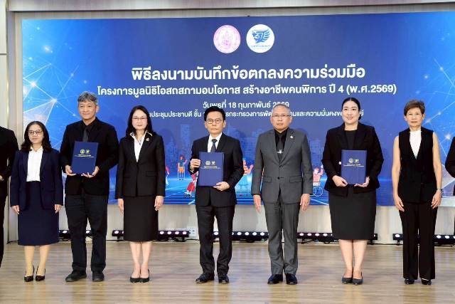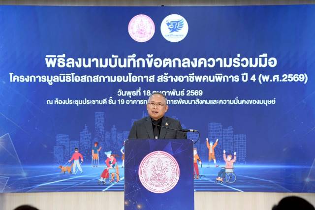 วันที่ 18 กุมภาพันธ์ 2569 นายอัครา พรหมเผ่า รัฐมนตรีว่าการกระทรวงการพัฒนาสังคมและความมั่นคงของมนุษย์ (รมว.พม.) มอบหมายให้นายกันตพงศ์ รังษีสว่าง ปลัดกระทรวงการพัฒนาสังคมและความมั่นคงของมนุษย์ (ปลัด พม.) เป็นประธานและสักขีพยานในพิธีลงนามบันทึกข้อตกลงความร่วมมือ (MOU) โครงการมูลนิธิโอสถสภามอบโอกาส สร้างอาชีพคนพิการ ปี 4 (พ.ศ. 2569) ระหว่างกระทรวงการพัฒนาสังคมและความมั่นคงของมนุษย์ (พม.) กับ บริษัท โอสถสภา จำกัด (มหาชน) โดยมี นางสาวสนธยา บุณยภูษิต อธิบดีกรมส่งเสริมและพัฒนาคุณภาพชีวิตคนพิการ และนายประธาน ไชยประสิทธิ์ รองประธานกรรมการมูลนิธิโอสถสภา กล่าวเจตนารมณ์ความร่วมมือในการสร้างโอกาส พัฒนาทักษะ ยกระดับชีวิตคนพิการ พร้อมด้วยคณะผู้บริหารกระทรวง พม. และ มูลนิธิโอสถสภา , คณะนักศึกษาหลักสูตรการป้องกันราชอาณาจักร (วปอ.) รุ่นที่ 68 , คนพิการ และผู้ดูแลคนพิการ เข้าร่วมงาน นอกจากนี้ ยังมีเวที TED Talk หัวข้อ “เมื่อพลังเริ่มต้นที่ตัวเรา : พัฒนาศักยภาพ สร้างคุณค่า และส่งต่อสู่สังคมแห่งโอกาส” โดยคนพิการที่เข้าร่วมโครงการฯ ณ ห้องประชุมประชาบดี ชั้น 19 กระทรวงการพัฒนาสังคมและความมั่นคงของมนุษย์ สะพานขาว กรุงเทพฯ
