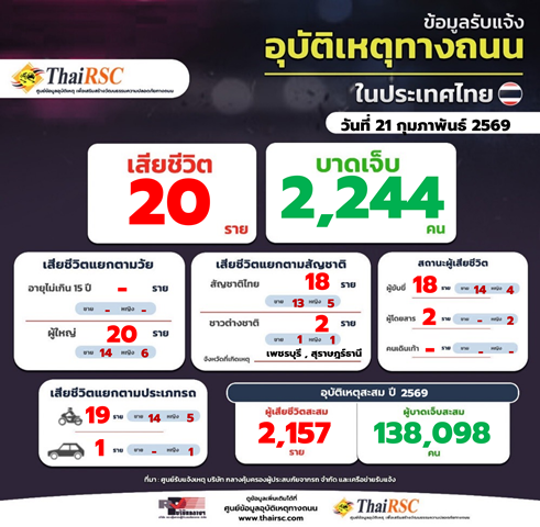 สถานการณ์อุบัติเหตุทางถนนในประเทศไทย รายสัปดาห์ 15-21 ก.พ. 69 22 กุมภาพันธ์ 2026Thailandplusประชาสัมพันธ์ Facebook iconFacebookTwitter iconTwitterLINE iconLineสถานการณ์อุบัติเหตุทางถนนในประเทศไทย วันที่ 21 ก.พ. 69