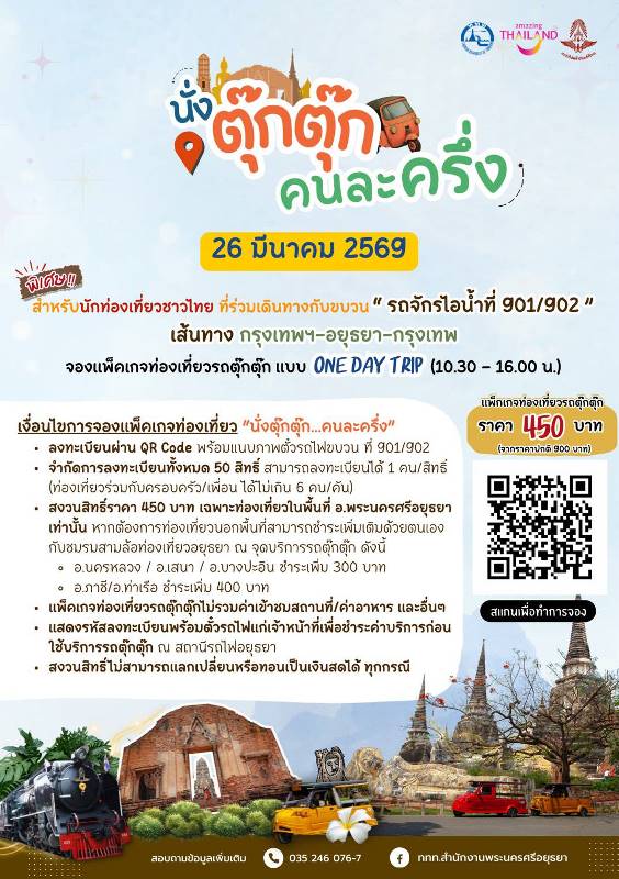 ในโอกาสพิเศษนี้ การรถไฟฯ ได้ร่วมกับ ททท.สำนักงานพระนครศรีอยุธยา จัดแพคเกจท่องเที่ยวราคาพิเศษ “นั่งตุ๊กตุ๊กคนละครึ่ง” ให้แก่นักท่องเที่ยวที่ร่วมเดินทางกับขบวนรถพิเศษนำเที่ยวรถจักรไอน้ำในวันดังกล่าว ในราคาพิเศษคันละ 450 บาท จากปกติราคา 900 บาท โดยสามารถใช้เดินทางไปยังสถานที่ท่องเที่ยวสำคัญภายในจังหวัดพระนครศรีอยุธยาได้ ตั้งแต่เวลา 10.30 น. – 16.00 น. ผู้สนใจสามารถลงทะเบียนผ่าน QR Code พร้อมแนบหลักฐานตั๋วโดยสารขบวนดังกล่าว สอบถามข้อมูลเพิ่มเติมที่ การท่องเที่ยวแห่งประเทศไทย สำนักงานพระนครศรีอยุธยา หมายเลขโทรศัพท์ 035 246 076 ในวันและเวลาราชการ