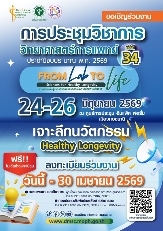 กรมวิทยาศาสตร์การแพทย์ ขอเชิญร่วม “การประชุมวิชาการวิทยาศาสตร์การแพทย์ ครั้งที่ 34 ประจำปี 2569” เปิดลงทะเบียนฟรี-30 เมษายนนี้