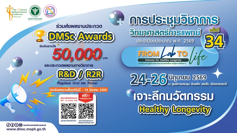 กรมวิทยาศาสตร์การแพทย์ กระทรวงสาธารณสุข ขอเชิญส่งผลงานวิชาการเข้าร่วมประกวดรางวัล DMSc Awards และเชิญชวนผู้สนใจร่วมการประชุมวิชาการวิทยาศาสตร์การแพทย์ ครั้งที่ 34 ประจำปีงบประมาณ พ.ศ. 2569 ซึ่งจัดขึ้นระหว่างวันที่ 24–26 มิถุนายน 2569 ณ ศูนย์การประชุมอิมแพ็ค ฟอรั่ม เมืองทองธานี จังหวัดนนทบุรี โดยเปิดให้ลงทะเบียนเข้าร่วมประชุม โดยไม่เสียค่าใช้จ่าย – 30 เมษายน 2569