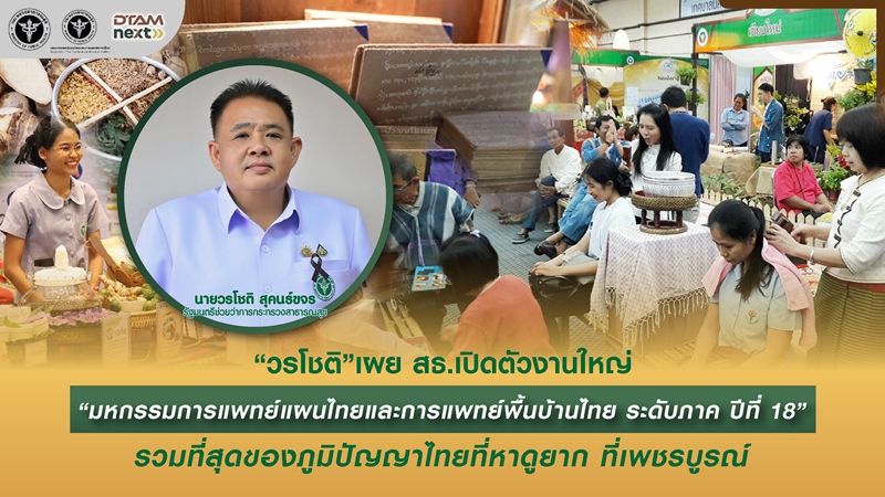 วรโชติ รมช.สธ.เปิดงานใหญ่ระดับประเทศ “มหกรรมการแพทย์แผนไทยและการแพทย์พื้นบ้านไทย ระดับภาค ปีที่ 18” พบกับ 50 บูธสุขภาพ เจาะลึกภูมิปัญญาหมอพื้นบ้าน พร้อมถอดรหัสตำรับยาโบราณ รวมที่สุด ของภูมิปัญญาไทยที่หาดูยาก พิธีมอบเกียรติบัตรและเข็มเชิดชูเกียรติให้แก่ “หมอนวดมือทอง” จาก 76 จังหวัดทั่วประเทศ หวังกระตุ้นเศรษฐกิจฐานรากและส่งเสริมการท่องเที่ยวเชิงสุขภาพอย่างครบวงจร งานจัดขึ้นระหว่างวันที่ 12–14 มีนาคมนี้ ณ สวนสาธารณะเฉลิมพระเกียรติเทศบาลพุเตย (พุเตยสปา) จ.เพชรบูรณ์