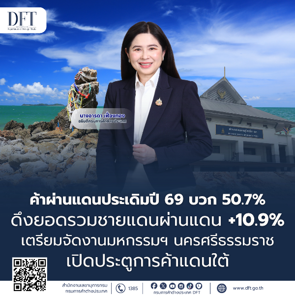 อธิบดีกรมการค้าต่างประเทศกล่าวว่าการค้าชายแดนและผ่านแดนของไทยเริ่มต้นปี 2569 ในแดนบวก จากแรงขับเคลื่อนของการค้าผ่านแดนที่ขยายตัว 50.7% และการส่งออกขยายตัวสูงถึง 78.9% โดยการส่งออกผ่านแดนไปยังตลาดหลักขยายตัวทั้ง 3 ตลาด ได้แก่ จีน มูลค่าส่งออก 22,830 ล้านบาท ขยายตัว 66.9% จากสินค้าสำคัญ เช่น ทุเรียนสด 6,567 ล้านบาท (+682.7%) และฮาร์ด ดิสก์ ไดรฟ์ 5,182 ล้านบาท (+97.7%) สิงคโปร์ มูลค่าการส่งออก 14,207 ล้านบาท ขยายตัว 285.8% จากสินค้าสำคัญ เช่น เครื่องรับโทรศัพท์และอุปกรณ์ 6,761 ล้านบาทv(+6,924.1%) และเครื่องคอมพิวเตอร์และอุปกรณ์ อื่น ๆ 1,649 ล้านบาท (+218.6) และเวียดนาม มูลค่าการส่งออก 3,727 ล้านบาท ขยายตัว 4.8% จากสินค้าสำคัญ เช่น น้ำแร่น้ำอัดลมที่ปรุงรส 1,015 ล้านบาท (+51.6%) และสินค้าปศุสัตว์อื่น ๆ 876 ล้านบาท (+55.5%)