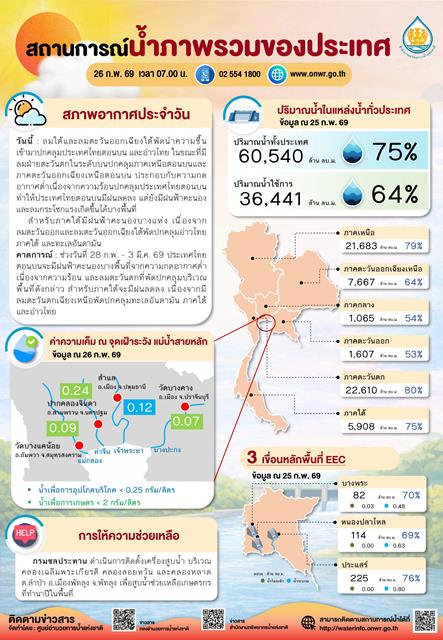 2. สถานการณ์น้ำอ่างเก็บน้ำในภาพรวม : ปริมาณน้ำรวม 75% ของความจุเก็บกัก (60,540 ล้าน ลบ.ม.) ปริมาณน้ำใช้การ 64% (36,441 ล้าน ลบ.ม.) มากกว่าปี 2567 จำนวน 5,926 ล้าน ลบ.ม.