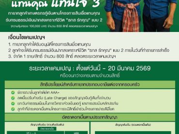 ธ.ก.ส. จัดแคมเปญแทนคุณ แทนใจ 3 เมื่อใช้บริการสินเชื่อแทนคุณ รับเลย ธกส รักคุณ คุ้มครองสูงสุด 1 แสนบาท