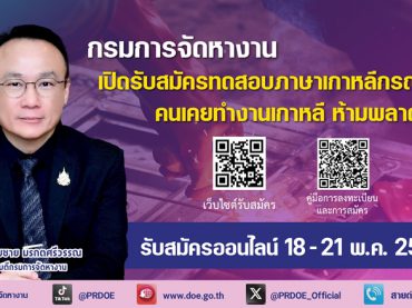 โอกาสมาอีกครั้ง!! กรมการจัดหางาน เปิดรับสมัครทดสอบภาษาเกาหลีกรณีพิเศษ สมัครผ่านออนไลน์ 18 – 21 พ.ค. นี้