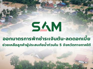 SAM ออกมาตรการพักชำระเงินต้น-ลดดอกเบี้ยสูงสุด 3 เดือน ช่วยเหลือลูกค้าผู้ประสบภัยน้ำท่วมใน 5 จังหวัดทางภาคใต้ เพื่อบรรเทาความเดือดร้อน