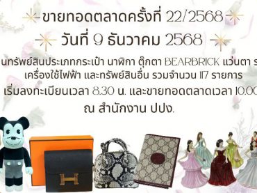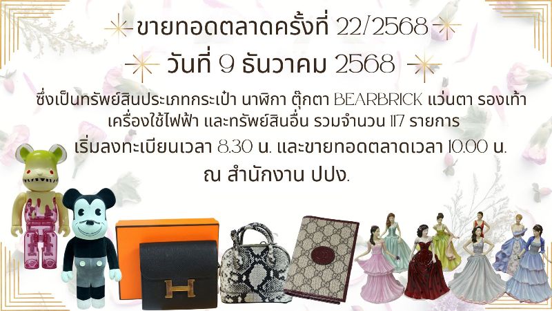 ปปง. ขายทอดตลาดทรัพย์สินประเภทกระเป๋า นาฬิกา ตุ๊กตา BEARBRICK แว่นตา รองเท้า เครื่องใช้ไฟฟ้า และทรัพย์สินอื่น ในวันที่ 9 ธันวาคม 2568 นี้