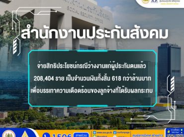 ประกันสังคมเร่งเคลียร์จ่ายสิทธิว่างงานแล้ว 208,404 ราย เป็นจำนวนเงินทั้งสิ้น 618,153,336.75 บาท ยืนยันผู้ประกันตนได้เงินครบทุกรายเพื่อบรรเทาความเดือดร้อนของผู้ประกันตนที่ได้รับผลกระทบ