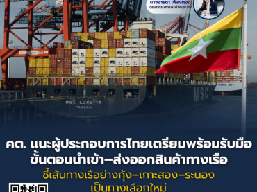 คต. แนะผู้ประกอบการไทยเตรียมพร้อมรับมือขั้นตอนนำเข้า–ส่งออกสินค้าทางเรือ ชี้เส้นทางเรือย่างกุ้ง–เกาะสอง–ระนองเป็นทางเลือกใหม่