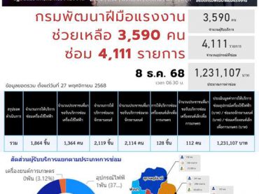 กรมพัฒนาฝีมือแรงงาน จัดศูนย์บริการ “ซ่อม สร้าง สุข” ช่วยเหลือผู้ประสบอุทกภัยภาคใต้ ประชาชนเข้ารับบริการกว่า 3 พันคน ลดค่าใช้จ่ายกว่าล้านบาท