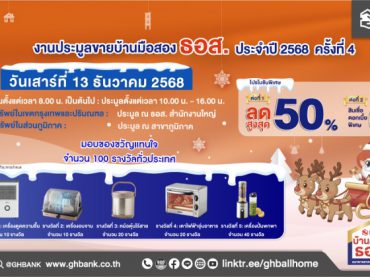 โอกาสสุดท้ายปี 68 !! ธอส. คัดบ้านมือสองทั่วไทยจัดประมูลใหญ่ ลดราคาสูงสุด 50% พร้อมโปรโมชันพิเศษ พบกันวันเสาร์ที่ 13 ธันวาคม 2568