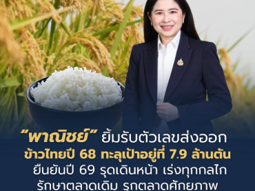 “พาณิชย์” ยิ้มรับตัวเลขส่งออกข้าวไทยปี 68 ทะลุเป้าอยู่ที่ 7.9 ล้านตัน ยืนยันปี 69 รุดเดินหน้า เร่งทุกกลไกรักษาตลาดเดิม รุกตลาดศักยภาพ