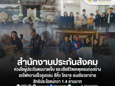 สำนักงานประกันสังคม ห่วงใยผู้ประกันตนบาดเจ็บ และเสียชีวิต เหตุเครนก่อสร้างรถไฟความเร็วสูงถล่ม สีคิ้ว โคราช เร่งเยียวยาจ่ายสิทธิประโยชน์กว่า 1.4 ล้านบาท